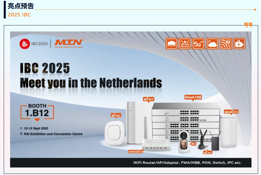 This exhibition covers the entire ecosystem of broadcasting, digital media, communications, and content technologies. MTN Electronics will showcase its latest technological advancements and applications, including switches, AI-IPC, Wi-Fi 7, 5G CPE, and cloud networking products, to explore industry trends, explore collaborative development, and unlock the infinite possibilities of a digital world of intelligent and innovative network communications.